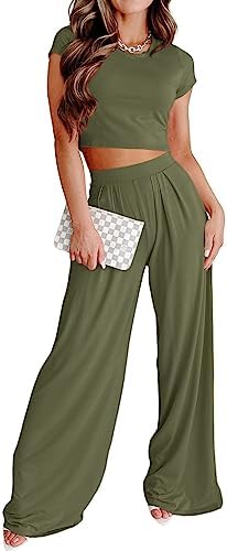 This product is a women’s 2 piece outfit that includes a short sleeve crewneck crop top and wide leg long pants. It is a fashionable lounge set for women and can also be worn as pajama sets. The crop top is slim fitted and the set comes in various colors. The model in the picture is wearing a size small.