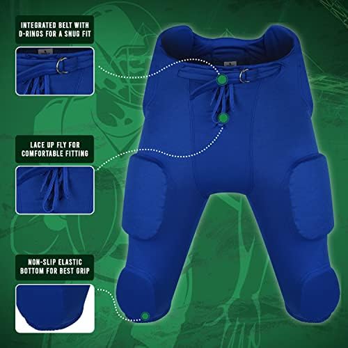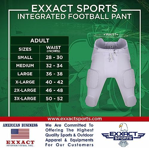 Exxact Sports Integrated Football Padded Pants are designed to meet the demands of football players who want the best. These pants are made with a highly durable pro-grade 100% polyester fabric that allows for freedom of movement on the field. The tailored fit ensures that extra fabric does not interfere with gameplay. Additionally, the pants have 7 integrated pads at critical contact spots (hips, thighs, knees, and tailbone) to provide superior protection. The moisture-wicking and breathable fabric keeps players cool and dry during intense games. The pants also feature an integrated belt, steel D-ring, and lace-up fly to prevent sliding and untucking. These high-rise football pants will elevate football performance. Order now to experience comfort, protection, and durability. The pants have dimensions of 8 x 9 x 8 inches and weigh 1.57 pounds. They are designed for men and were first available on April 18, 2022. The manufacturer is Exxact Sports, and the ASIN is B09Y7D7TF7. The pants are imported and have a D-ring and lace-up fly closure. They can be machine washed. The pants offer pro-level protection with 7 integrated pads at critical contact spots. The design includes EVA foam embossed 7 bubble design pads, semi-rigid pads on the thighs, knees, and tailbone, and high-rise flexible pads on the hips. The pants are made with a highly durable and stretchable 100% polyester fabric that allows for freedom of movement. The tailored fit offers comfort and style, making the wearer the envy of their friends.