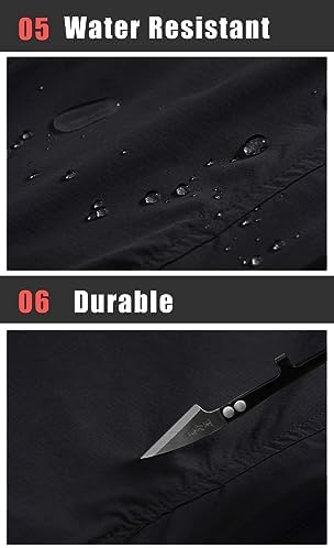 The product includes a zipper closure and is machine washable. It is made of nylon and spandex, which makes it quick-drying, lightweight, and breathable. The fabric is also water-resistant, providing protection during outdoor activities. The pants have a comfort fit side elastic waist and a straight leg. They have multiple pockets, including a big pocket and zipper pockets on the thighs, as well as hand and back zipper pockets. The pants are suitable for various outdoor activities such as hiking, fishing, camping, climbing, and cycling, as well as for daily wear.