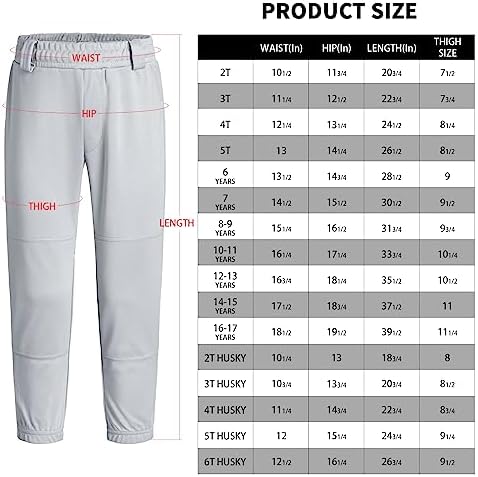 – Toddler baseball pants available in sizes 2T, 3T, 4T, 5T, 6T, and 7T.