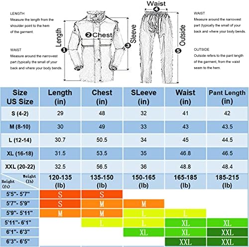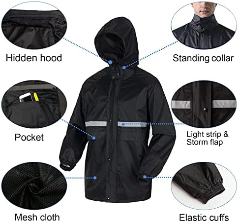 The rain suit is designed to be waterproof and breathable, allowing you to stay comfortable during outdoor activities. It also features a hidden hood, a high collar to prevent rain from entering through the collar, big hand pockets with waterproof covers for secure storage, elastic cuffs to keep wind and rain out, and a waterproof placket with double structure to prevent water leakage.