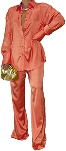 The product is a women’s silk satin 2-piece outfit consisting of a long sleeve lapel button-down top and wide-leg palazzo pants. It is made of polyester, specifically smooth satin fabric, which is soft and shiny. The outfit features a V-neck, long sleeves, a button closure, and a high elastic waist. It is available in 11 different colors. The set is suitable for all seasons and can be worn for clubwear, night parties, sleep, casual wear, loungewear, holidays, and nights out. The pants have an extra-long length, and the top has a button-down design with a lapel collar. The outfit is imported and should be hand washed only. The package dimensions are 14.33 x 10.24 x 1.65 inches, and it weighs 12.31 ounces. The item model number is TAOZHUANG005HEISE-S, and it is designed for women. The product was first available on June 29, 2022, and the ASIN is B0B5CBJBPD.