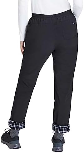 The Eddie Bauer Women’s Stretch Fleece Lined Polar Pant is a relaxed fit pant with plaid lined detail. The waistband sits below the waist and features StormRepel DWR technology to wick away moisture. The pant is made with stretch fabric for extra comfort and has two front pockets and a secure zip pocket on the thigh. The waistband has an elastic drawstring for adjustable fit. The shell and lining are made from a combination of polyester and elastane, with a lightweight construction of approximately 170 GSM. The pant is available in sizes S (4-6), M (8-10), L (12-14), and XL (16-18), with an inseam length of 31 inches. The model in the product images is 5’7″ tall and is wearing a size 10.