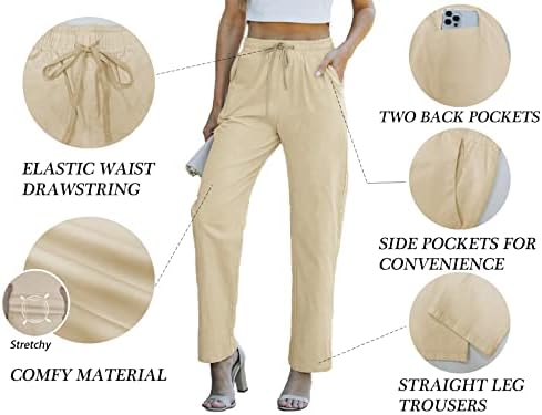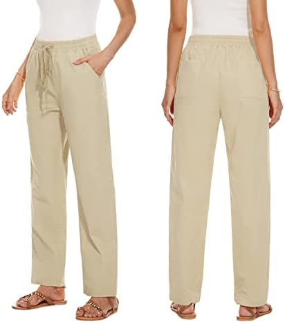 BUY NOW – HVEPUO Womens Casual Elastic Waist Drawstring Pants Straight Cotton Trousers with Pockets