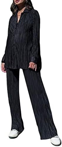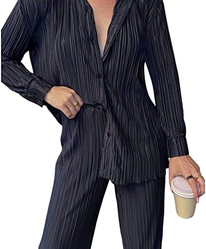 BUY NOW – Women ‘s Casual 2 Piece Outfits, Long Sleeve Button Down Pleated Shirt + Pants Set