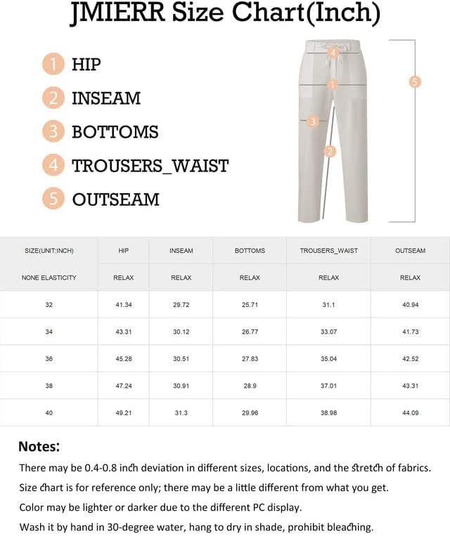 JMIERR Men’s Clothing offers high-quality and sustainable clothing for men. The brand covers a wide range of categories including flannel clothes, pants, hoodies & sweatshirts, fall winter jackets, and knit sweaters. JMIERR is known for its accurate sizing and provides a detailed size chart for customers to find their perfect fit. The brand is modern and innovative, offering stylish and sporty clothing for the contemporary man. The package dimensions of the product are 10.39 x 4.25 x 2.28 inches and it weighs 3.53 ounces. The item model number is JMDM771127-18-42 and it is available for purchase since May 10, 2023. The ASIN is B0C4TS84NQ. The pants are made of 55% cotton and 45% linen, which makes them lightweight, breathable, and comfortable. They have an elastic waist with a drawstring and belt loops for adjustability. The trousers have a straight leg design with pockets on the back and sides. They are perfect for casual and leisure wear, suitable for activities like yoga, vacation, beach, hiking, and golf. The package includes 1 pair of men’s casual pants and customers are advised to refer to the JMIERR size chart before ordering.