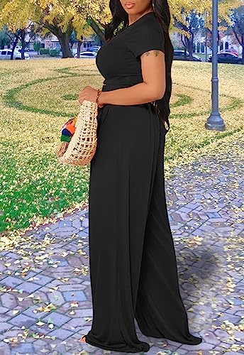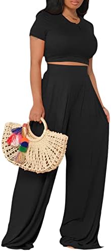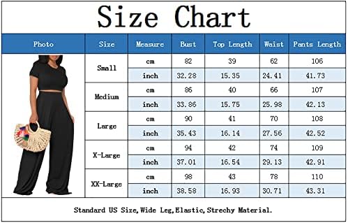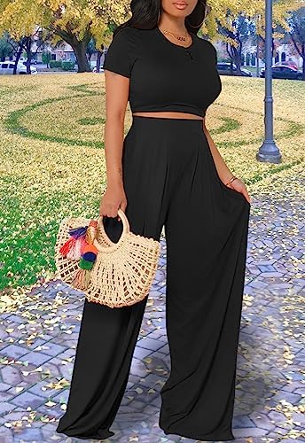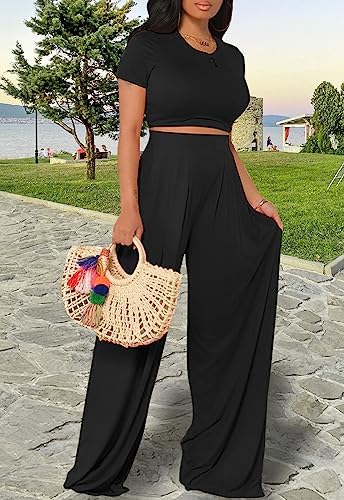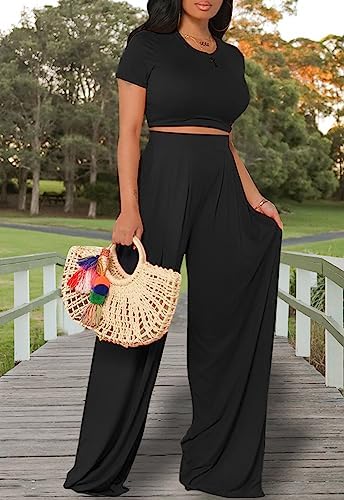 Women’s Casual Summer 2 Piece Outfits: Short Sleeve Crop Top & Wide Leg Pants Set Jumpsuits