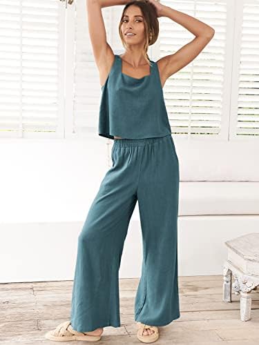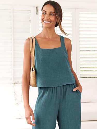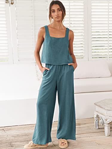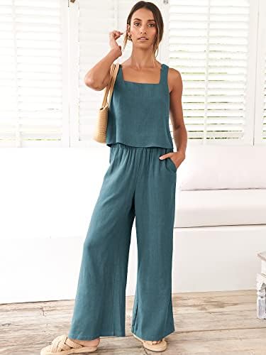 ANRABESS Women’s Square Neck Linen Tank Crop Top and Wide Leg Pants Lounge Set