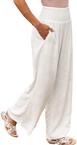 – Women’s solid color casual cotton linen high waisted wide leg smocked pants trousers