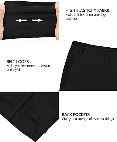 The women’s high waist dress pants feature a straight leg design and are tailored to fit your curves. The two faux pockets on the front can be used for decorative purposes, while the two real pockets on the back are great for carrying small items. The pants are flat-front pull-on with a non-functional button and faux fly, making them comfortable and convenient to wear. They are crafted from wrinkle-resistant, durable, and easy-care fabric that is 4-way stretch and not see-through. The elastic band at the waist offers extra flexibility and movement. The pants can be dressed up or down and are suitable for all seasons and climates. The inseam and waist measurements vary by size. They are machine washable and should be color separated and hung to dry. The package dimensions are 9.25 x 6.61 x 2.05 inches, and the item model number is QT-Straight Leg Pants-Regular-Black-S. The pants are imported and have a pull-on closure. They should be machine washed and hung to dry. The classic design features a straight-leg and high-rise silhouette, belt loops, two rear functional pockets, and two fake front pockets for a combination of practicability and style. The elastic band at the waist offers extra flexibility and movement.