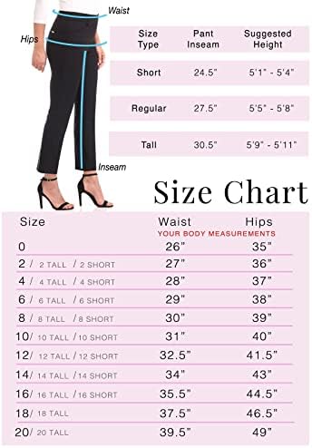 The pants have a pull-on styling with a contour waistband that has hidden elastic for a comfortable fit. They have real front pockets and faux back pockets, along with belt loops. The pants also feature pressed front and back leg creases, as well as back darts for a curve-hugging fit.