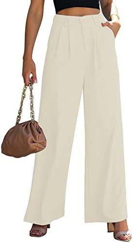 Womens wide leg pants with a 31 inch inseam. These GRAPENT women’s pants feature a high-waisted wide leg style, baggy loose fit, pleated front, elastic back, zip up with button closure, 2 functional real side pockets, and 2 decorative fake back pockets.