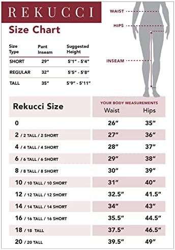 These Rekucci bootcut comfort pants are made of a flattering blend of Nylon, Rayon, and Spandex fabric. They have a bootcut leg shape that slims the hip and elongates the leg. The soft comfort waistband provides support for a slimming effect and a smooth silhouette. These pants are pull-on style, eliminating the need for buttons or zipper closures at the waist, increasing comfort and ease of wear. They are incredibly comfortable pull-on pants that have a modern and stylish look. The mid-rise style sits just below the belly button and the pant is fitted from the waist through the thigh with a slight flare from the knee to the hem. It is about 1″ less wide at the bottom than a typical bootcut, giving it a baby-bootcut style. These pants are available in sizes 0-20 and in regular, petite/short, and tall lengths, ensuring a great fit for all body types. It is recommended to machine wash them in cold water and hang to dry to avoid shrinkage. They are made in Cambodia and come with a size chart for reference. The pants have front and back belt loops, faux front and back pockets, and a pressed leg crease for a touch of chic. The pant inseam lengths are regular 32″, petite 29″, and tall 35″. They feature a pull-on style with a wide contour elasticized waistband that moves with you and smooths out any imperfections. The fabric is a stretch woven material that looks chic and crisp while feeling comfortable. The solid colors are made of 74% Rayon, 22% Nylon, and 4% Spandex, while the melange colors are made of 48% Polyester, 27% Rayon, 21% Nylon, and 4% Spandex.