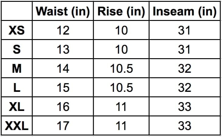 – Best to buy next size up if unsure of sizing! Garment Measurements: X-Small: Waist 24′ Rise 10′ Inseam 31′ S Waist 26′ Rise 10 inch Inseam 31′ Medium: Waist 28′ Rise 10.5′ Inseam 32′ Large: Waist 30′ Rise 10.5′ Inseam 32′ X-Large Waist 32′ Rise 11′ Inseam 33′ XX-Large: Waist 34′ Rise 11′ Inseam 33′ Model Measurements: Bust: 32 inch Waist: 26 inch Hips: 36 inch Height: 5’5 Model is wearing size Small. Fabric: 95% Polyester 5% Spandex