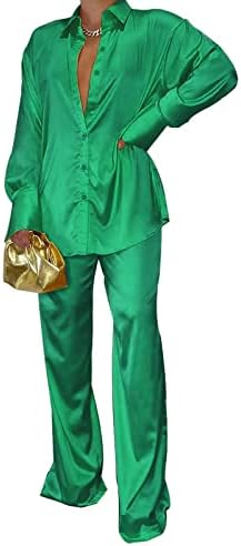 The product is a 2-piece outfit for women made of silk satin fabric. It includes a long sleeve button-down top and wide-leg palazzo pants. The outfit is suitable for all seasons and occasions such as clubwear, night parties, sleepwear, casual wear, loungewear, holidays, and nights out. The top has a lapel collar and button cuffs, while the pants have an extra-long length. The outfit is available in 11 different colors. It is imported and has a button closure. It should be hand washed only. The material is lightweight, smooth, and shiny, and it is not prone to pilling. The top features a V-neck design, while the pants have a high elastic waist and a loose fit. Overall, it is a comfortable and stylish outfit.