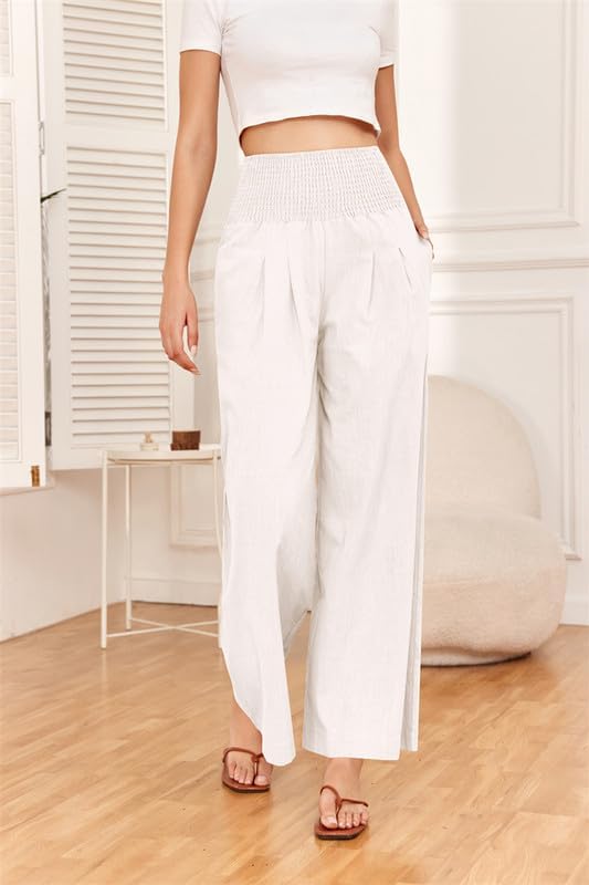 – Women Wide Leg Pants Elastic High Waist Trousers Cotton Smocked Beach Pants: These pants are made of lightweight and soft cotton linen fabric, providing breathability and comfort. They have an elastic waistband and a smocked high rise with an elastic band for a comfortable fit. The pants also feature pockets for a dressy and trendy look.